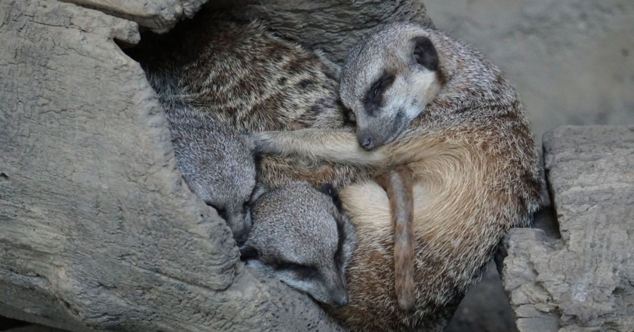 Meerkats live in communities of up-to 50 or more that are led by both alpha males and females. These cuddly animals sleep in their burrows – complex tunnel systems and sleeping quarters – in heaps protecting the alphas in the middle.