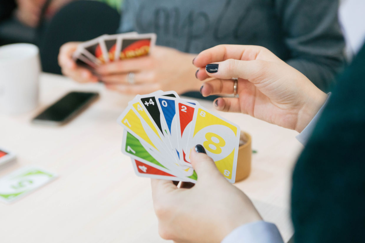 This classic card game is a family favorite. Every player starts with seven cards that they must discard into the center pile by matching color or number. There are wilds and cards that change directions or require players to pick additional cards. The winner is the person who uses his or her cards up first.
