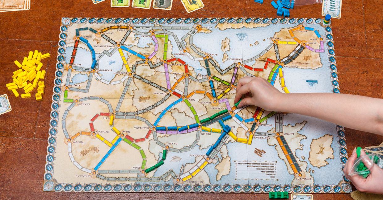 In this board game, players compete to build train routes on the board and earn points based on the length of the route. Players plan their routes based on the cards they draw and strategize on the best way to complete the routes. There are different versions and expansion packs. The original Ticket to Ride is the easiest one to play but the European version contains some interesting features.