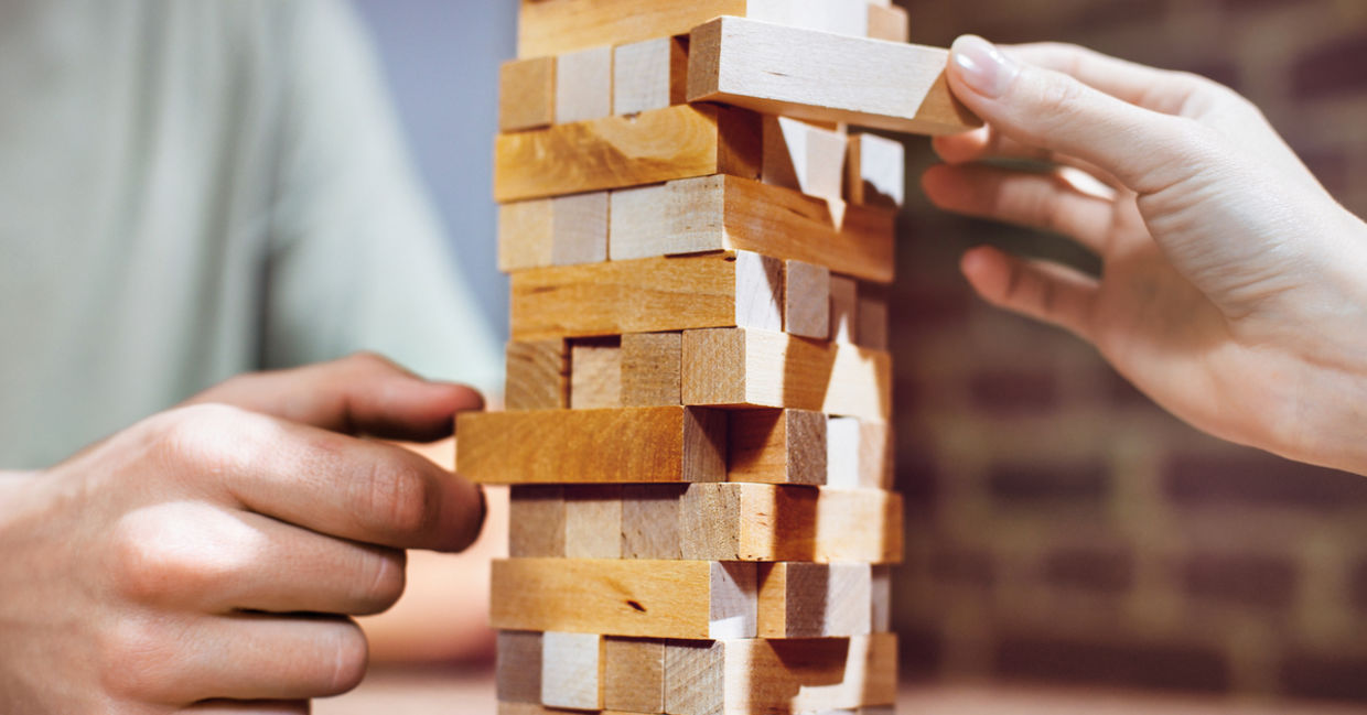 This game requires stacking wooden blocks into a tower and then pulling one out and putting it on the top until the tower collapses.