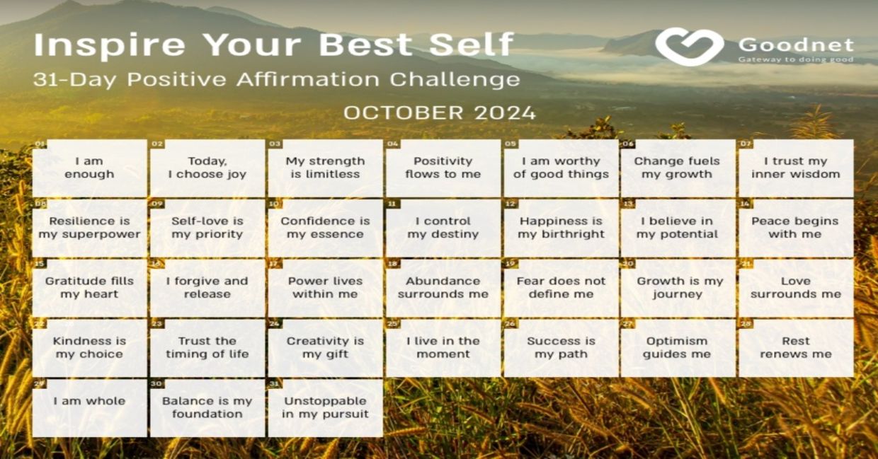 This challenge created for you by Goodnet, is an invitation to invest in yourself for 31 days. Start each day by repeating the daily affirmation, and notice how these powerful words shift your mindset, elevate your confidence, and transform your life. Let's embark on this journey of positivity together!