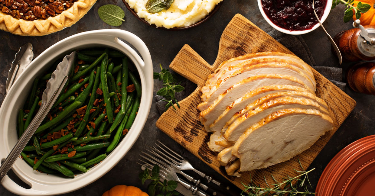 Turkey is already low in calories and a healthy part of the Thanksgiving meal. White meat has less fat than dark meat, so you if you are not feeding a crowd, you can make a breast instead of a whole turkey. Avoid the skin and go easy on the gravy.