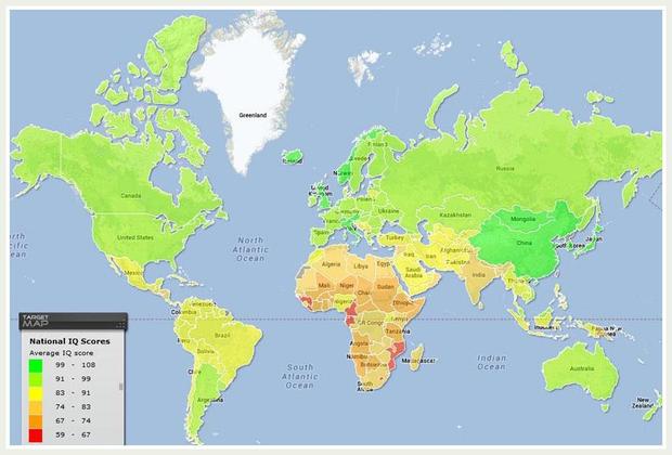 This first map shows average national IQ scores – a score derived from standardized tests to assess intelligence. The jury's still out as to why IQ scores vary so much around the world, with theories ranging from environmental factors to genetic influence.