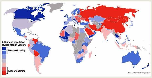 This surprising and interesting map uses data from the World Economic Forum, to rate how welcoming countries are to foreign visitors. The information was gathered using a survey in which people were simply asked, "How welcome are foreign visitors in your country?"