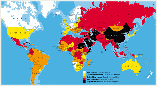 Scandinavia and northern Europe stand out as the frontrunners in this 2013 map, which shows respect for media freedom. We'd certainly like to see some more white on this one in years to come!