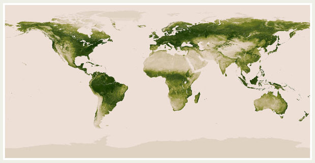 The dark green on this map indicates areas lushest in vegetation, while the pale colors point to areas which are sparse in vegetation cover - due to snow, drought, rock, or urbanization.