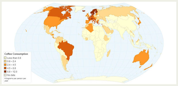 This highly caffeinated map shows the amount of coffee consumed annually (in kilograms) by each person in a given country or region. The global trend has been rising upward since the economic downturn of 2007.