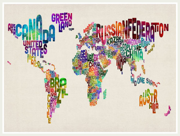 Last but certainly not least, this artistic creation depicts each of the world's countries using its name, shaped to be geographically correct. Smart AND pretty!