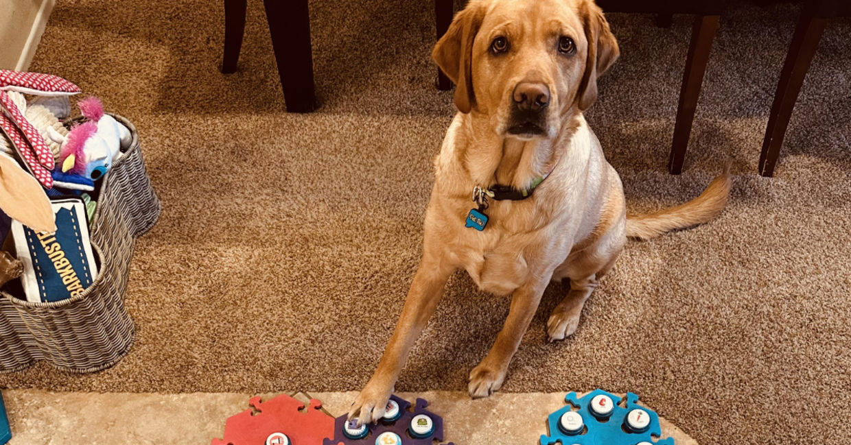 Copper, a young red fox Labrador, has learned to press buttons with pre-recorded words that have given her the ability to “speak” to her owner, Tia Herrell.