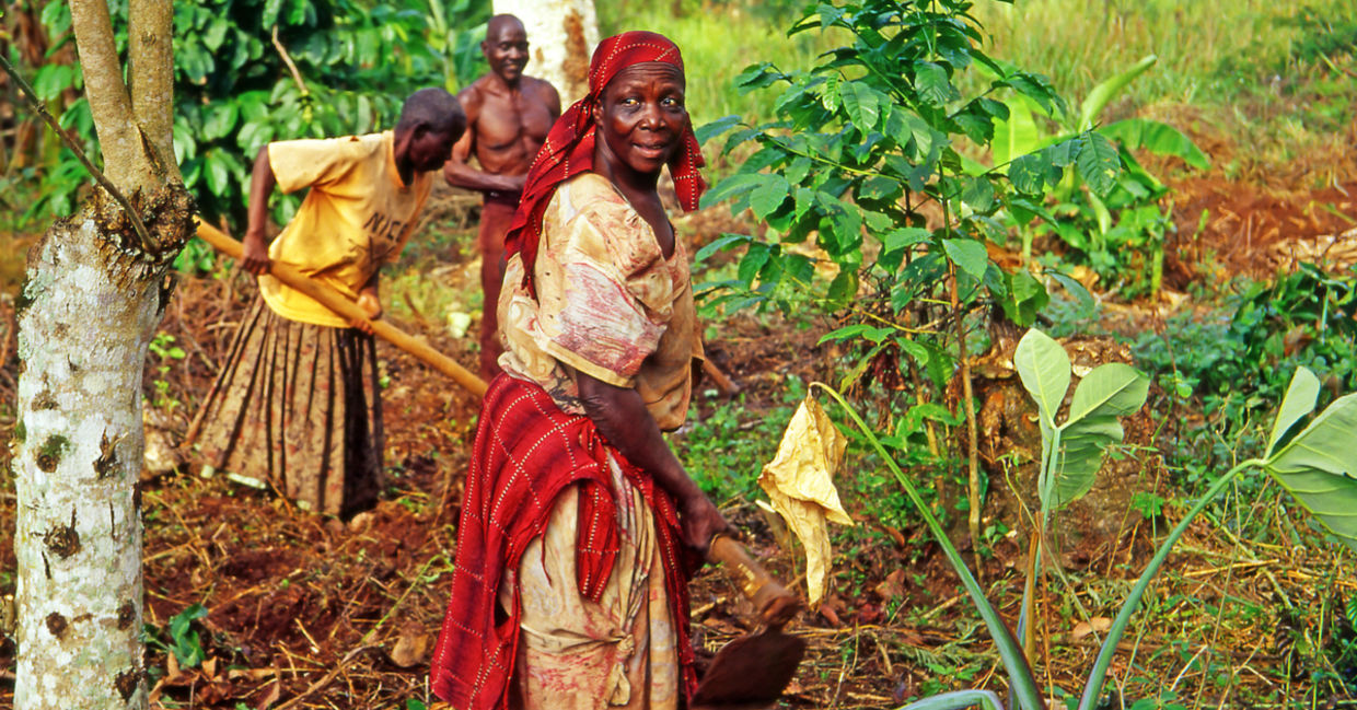 Unidentified farmers work on their fields on July 26, 2004, in Buikwe region, Uganda. (Pecold / Shutterstock.com)