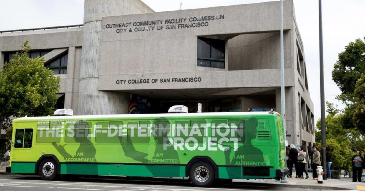 This is The Self-Determination Project bus. Launched by the Five Keys Charter School in 2017, the organization serves 5,000 eager learners around the city. The library, internet, study spaces, desks, and teachers are available free of charge to students after signing up.